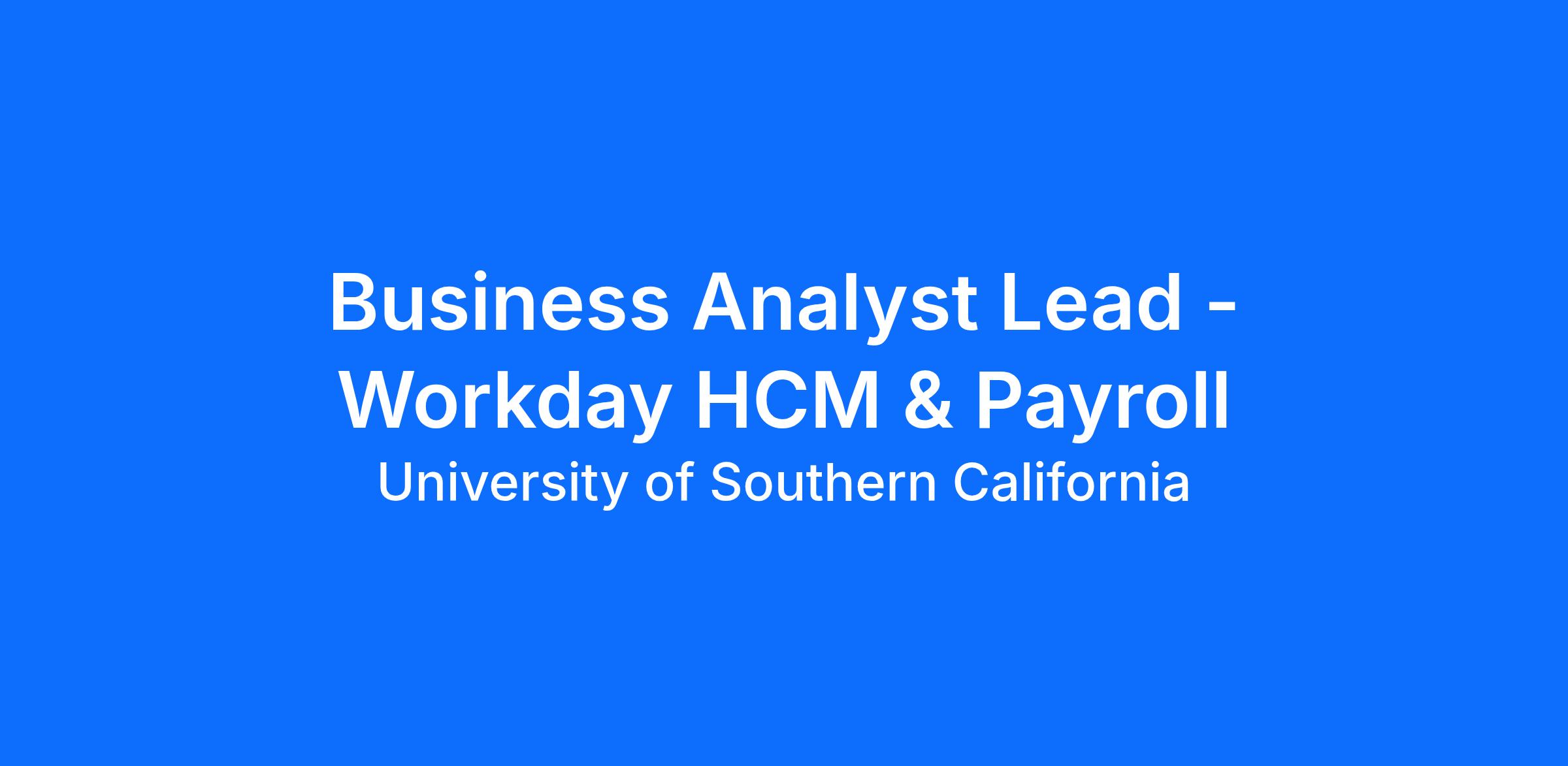 The University of Southern California (USC) is currently seeking a Business Analyst Lead - Workday HCM & Payroll to join our Application Services team. The Business Analyst Lead - Workday HCM & Payroll will support enterprise applications and business processes related to Workday HCM, Payroll, and associated financial functions.