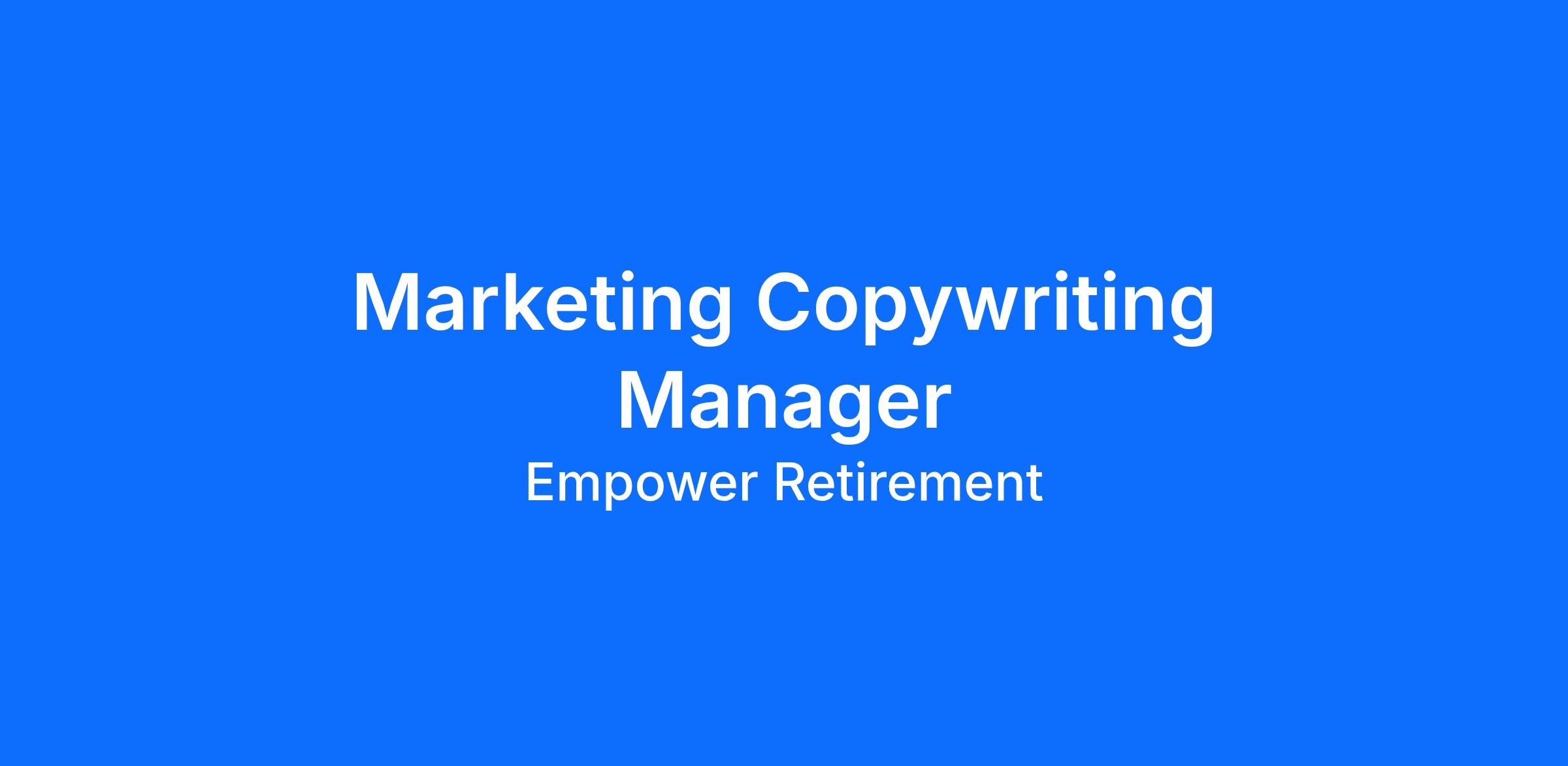 The Marketing Copywriting Manager leads the development of consumer-oriented creative and establishes high-quality, strategic copy direction across online and offline channels. This role is responsible for shaping brand-aligned, compliant messaging that supports consumer engagement and advances the Empower brand. The Marketing Copywriting Manager partners closely with designers, internal stakeholders, and cross-functional teams to deliver compelling advertising and educational materials while ensuring adherence to brand standards, creative briefs, and regulatory requirements.