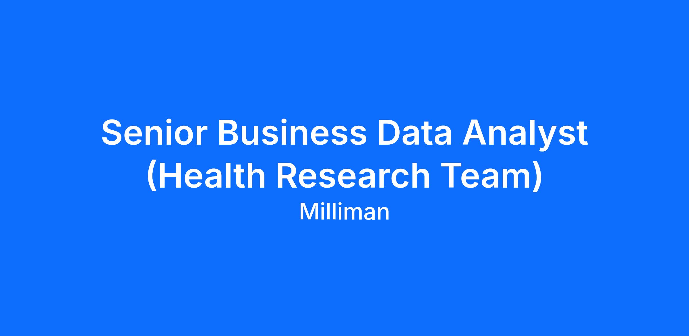 Milliman’s Health Research Team (HRT) is seeking an enthusiastic and detail-oriented Senior Business Data Analyst to enhance our data quality review initiatives and to support analytics projects under the guidance of the Senior Manager, Health Data Analytics.